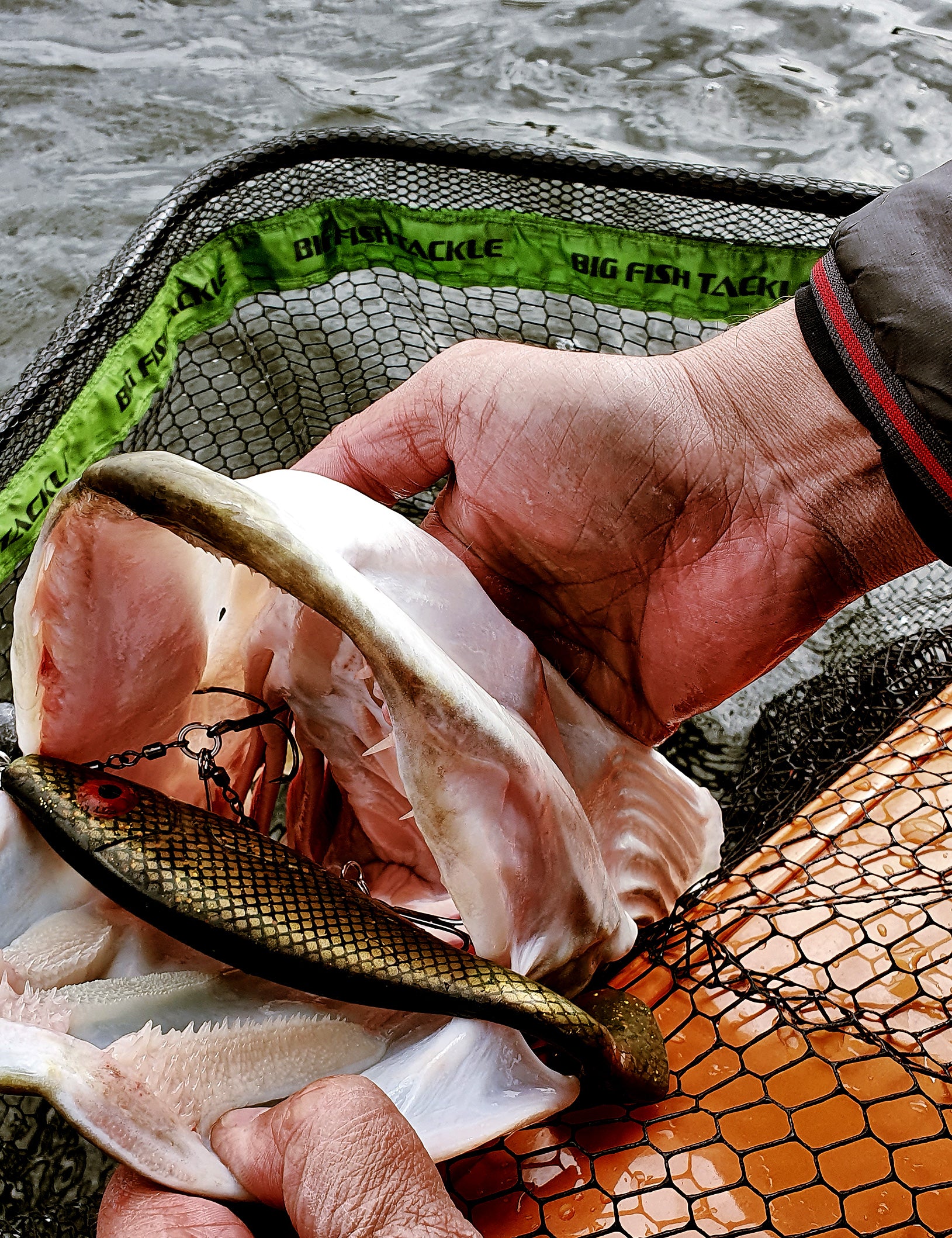 Picture of an angler hand holding a Musky in a RS nets and which has a Medussa lure in the mouth