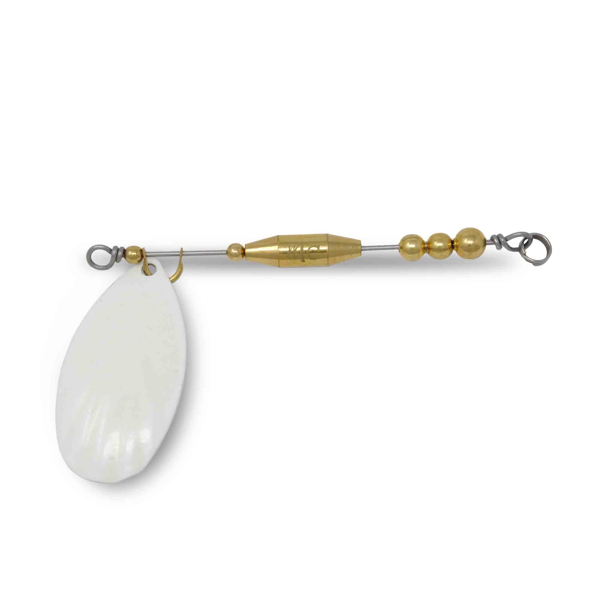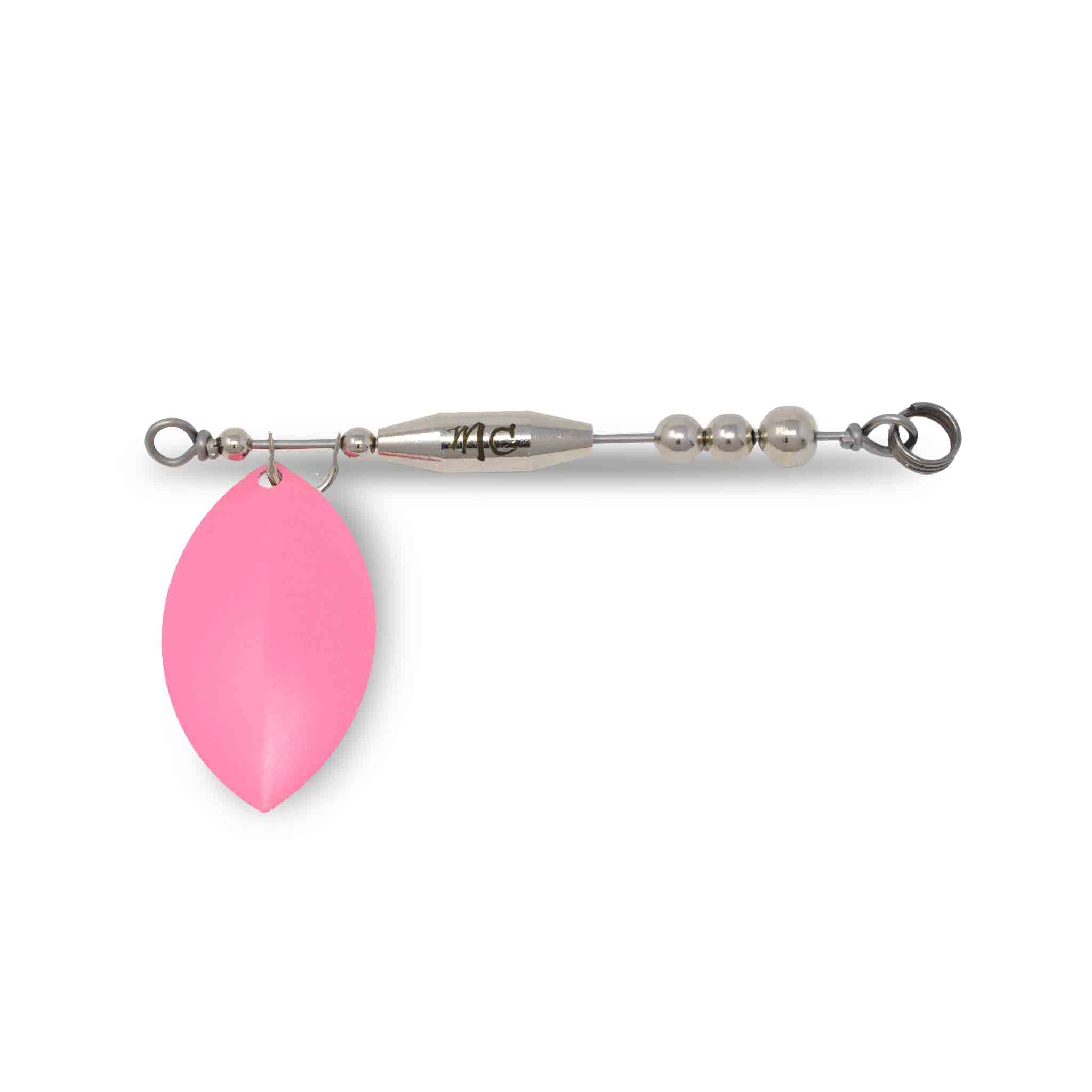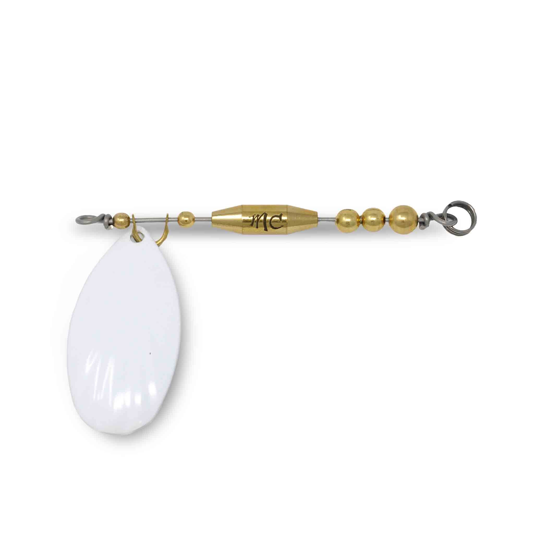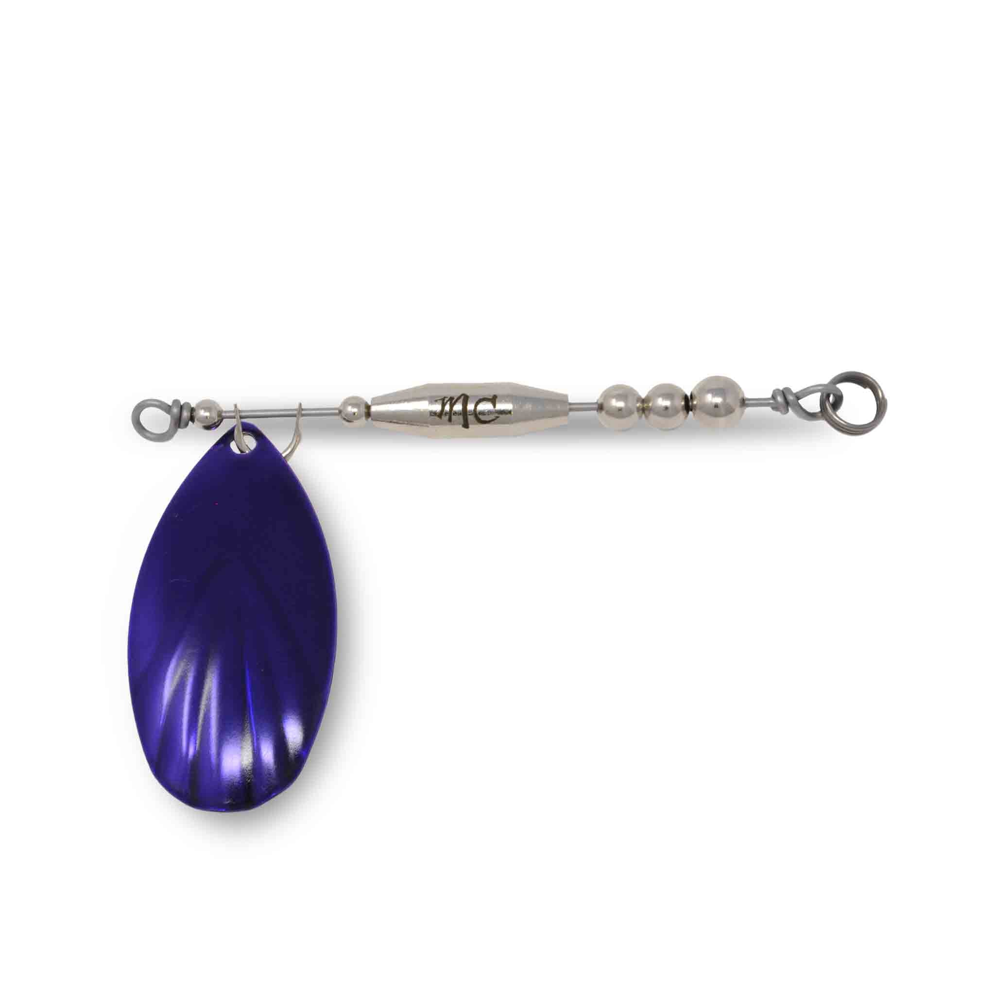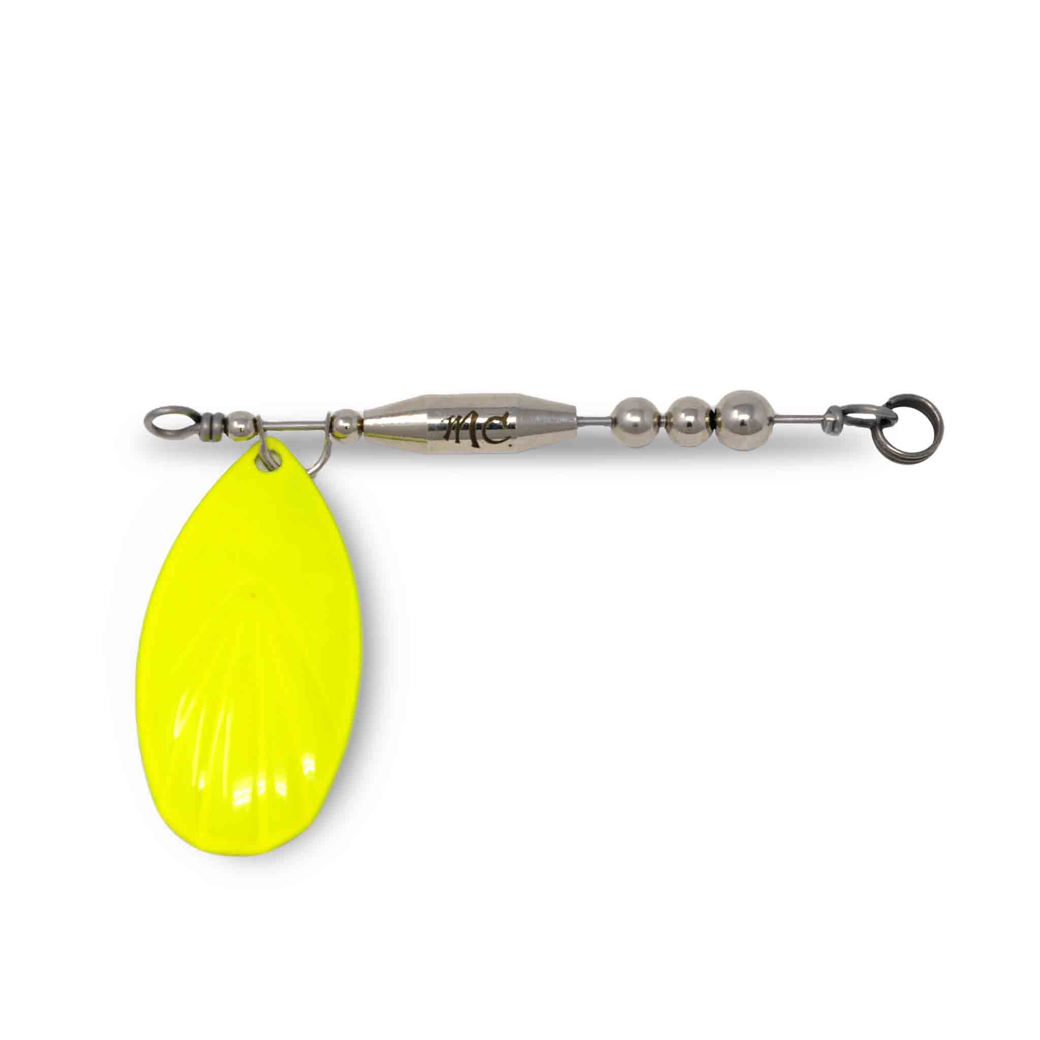 Le Mad Chasse Inline attachment est construit autour d'un axe en fil de 0,062 pouces, avec un corps gravé au laser, 5 billes, une lame simple (feuille de saule ou cannelée) et se termine par un anneau brisé en acier inoxydable #7 Wolverine Tackle pour l'attacher en toute sécurité à vos leurres ou mouches. Longueur de 4,75 pouces pour un poids de 1,1 oz.